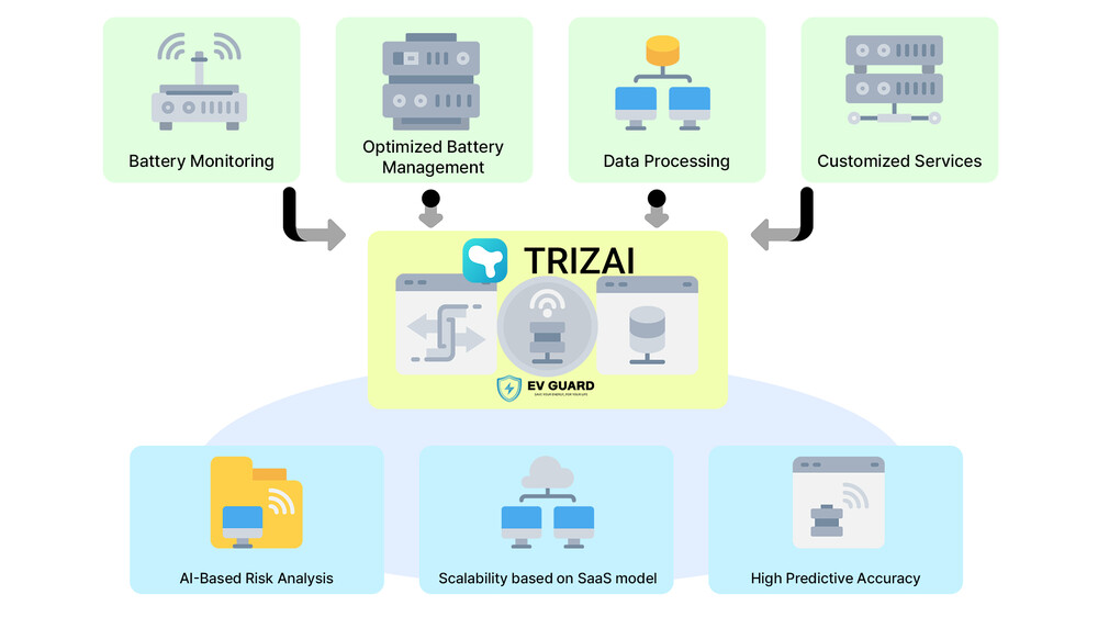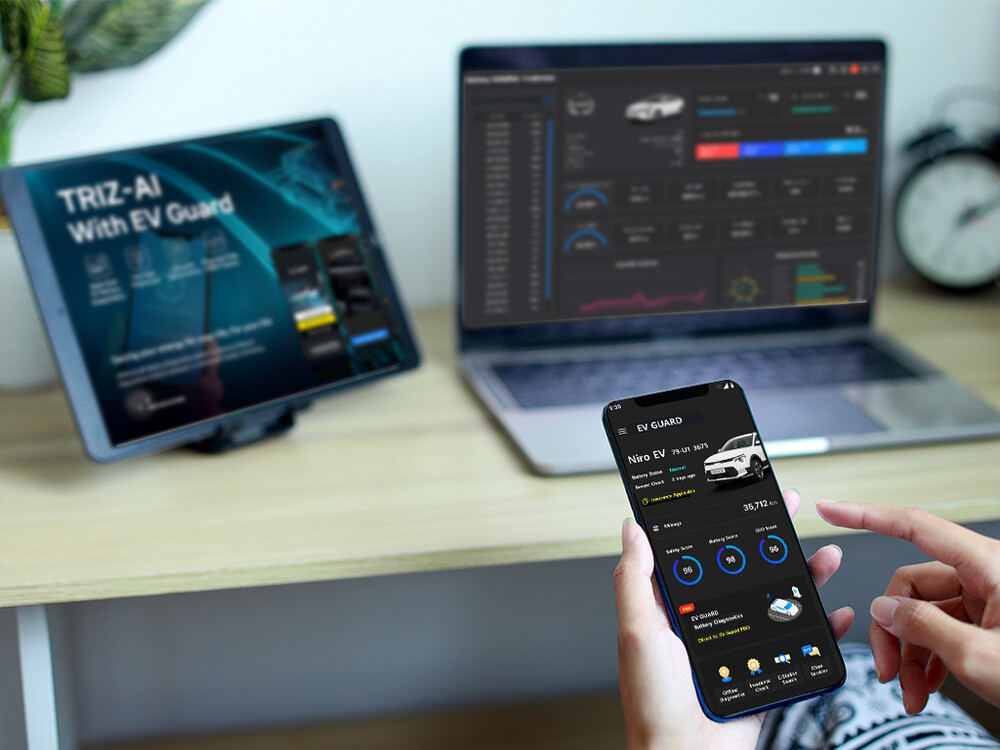 TRIZ-AI™ is a real-time diagnostic and predictive system for electric vehicle batteries. Drawing data from OBD2 (on-board diagnostics) systems, the Cloud-based AI platform monitors battery health, estimates remaining useful life (RUL), and identifies early signs of thermal (fire) risk.
